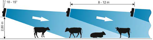 Оптимальное расстояние 2,80 м над землей. Угол наклона вентилятора 10-15° в зависимости от потребности в охлаждении и высоты монтажа. Количество: вентилятор RS 69 примерно на 40м2. Расстояние между вентиляторами:приблизительно 8м-12м.