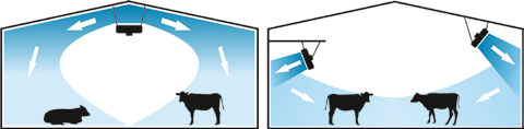 Рис.1: в режиме с направлением воздушного потока через потолок. Равномерная циркуляция воздуха в помещении, нет прямого направления потока воздуха на животных.