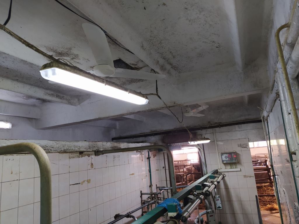 Идеален для низких помещений (доильный или преддоильный зал) - минимальное расстояние от нижней кромки вентилятора до земли 2,50 м.